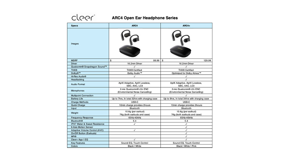 Cleer 推出兩款 Arc 4 無線耳機系列,包括 Arc 4 與 Arc 4+。均採用耳掛設計並通過 THX 認證,由 THX 工程師調音,搭載 16.2mm 驅動單元,帶來平衡頻率響應、清晰人聲及受控低音。Arc 4 支援 Dolby Audio,而 Arc 4+ 則支援 Dolby Atmos 空間音效,營造更立體的音場。