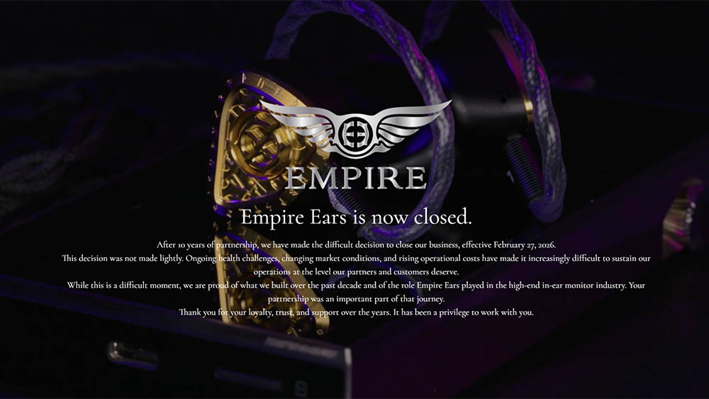 Empire Ears 突然宣布停止營運。全球代理商均無法與品牌方取得聯繫。香港代理 ECT 表示將以自家方式提供售後支援。