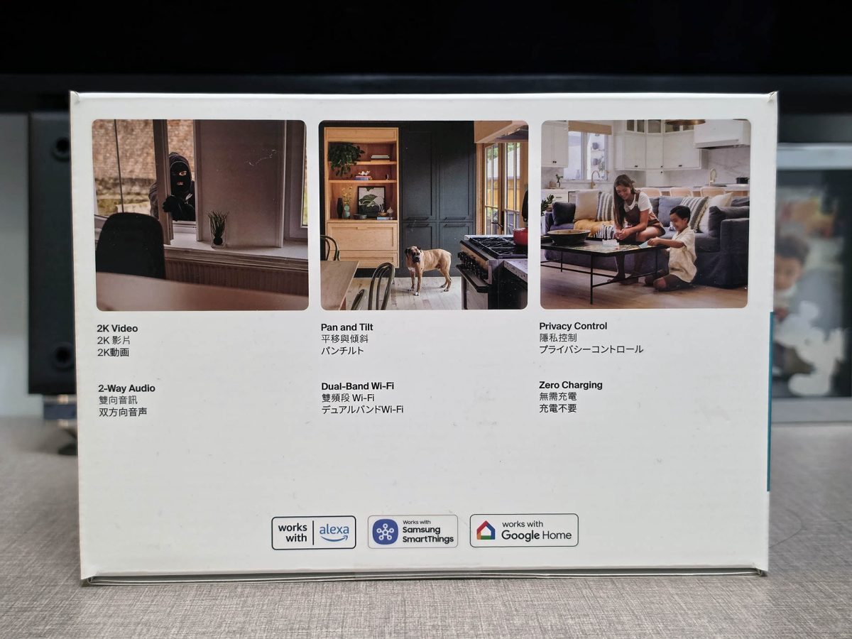 睇下個盒(圖 0),Arlo 一貫嘅簡約設計。今次呢部 Essential 最吸引我嘅地方,除咗係由 1080p 升級去 2K 畫質之外,最緊要係佢寫明有 “360° PAN & 180° TILT”。